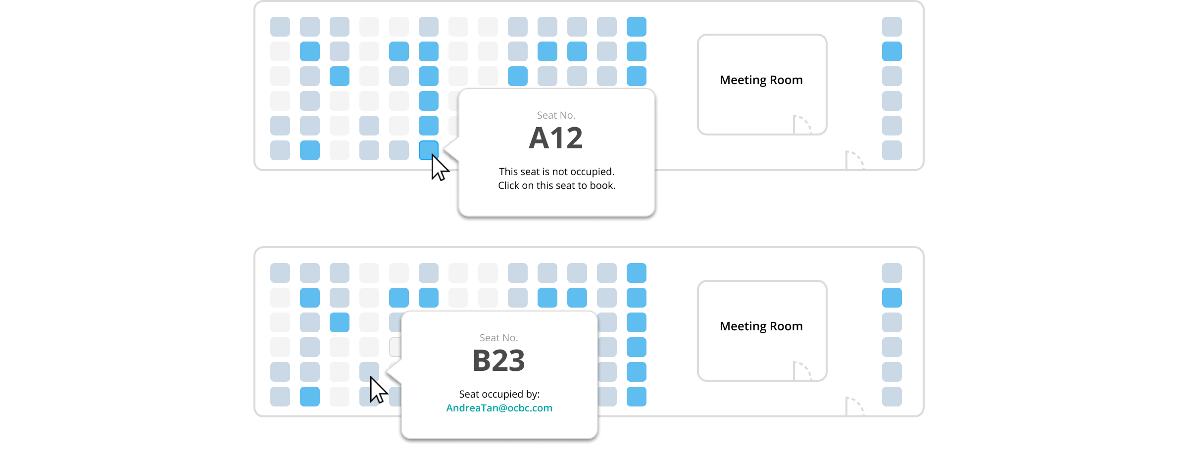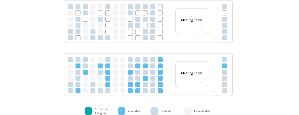 There were many ways to depict an empty seat and I settled on these. From our users’ standpoint, we found that they would like to know which seats were “Booked” versus “Unavailable” because they could then plan seating arrangements in the future with their fellow team mates.