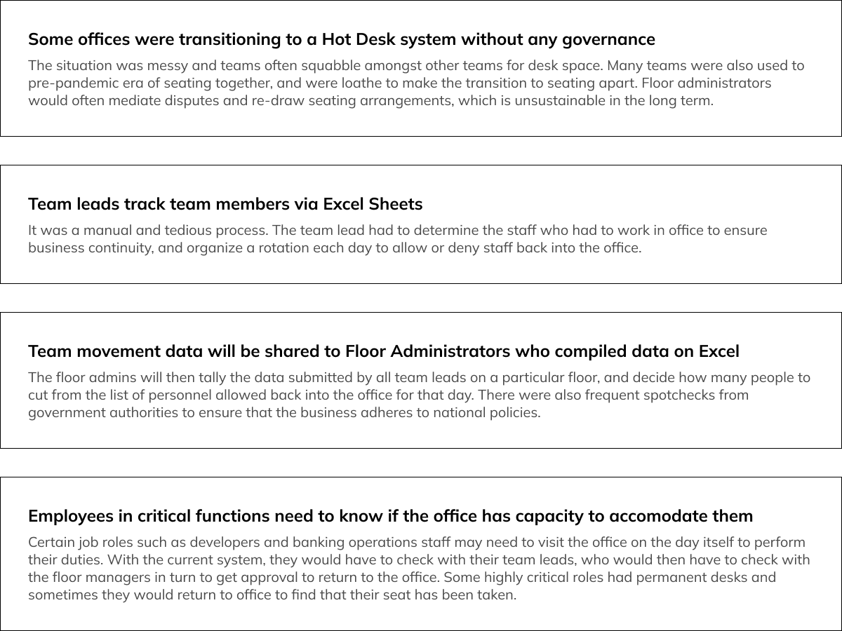 In early 2020, the Covid-19 virus hit the shores of Singapore and caused a lockdown. During this period, the organization started planning for life after the lockdown. A few issues rose to the surface the first week fellow colleagues went back to the office.