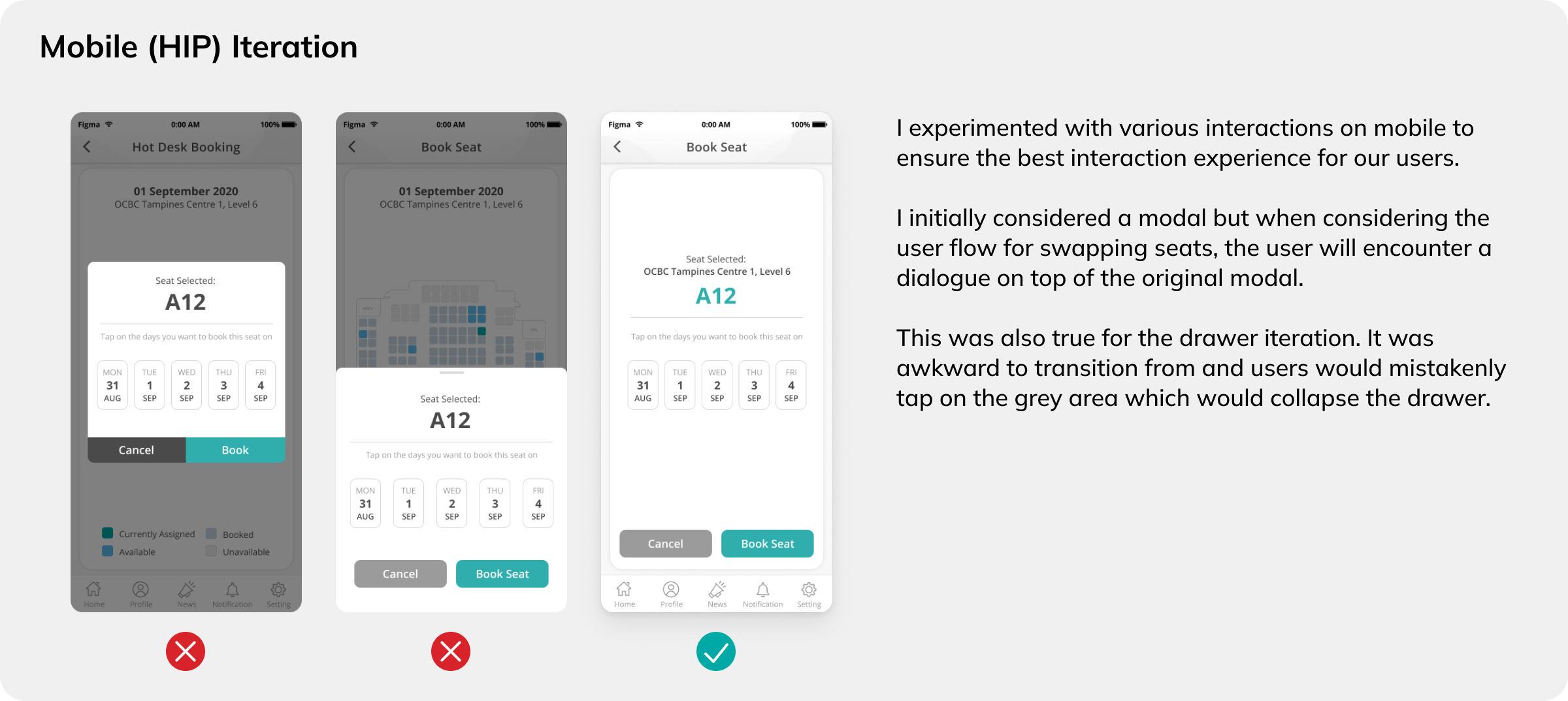 There were still intricacies within the system I have to solve. While booking a seat, how should a user select which days of the week she would like to book? Would there be AM/PM check-ins?