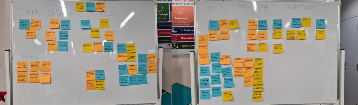 The design team, consisting of myself and one other UX designer at that time, split the research work, interviewing employees in various capacities to determine the crux of the issue. We plotted and empathy map on the left image, and organized the findings into opportunities.