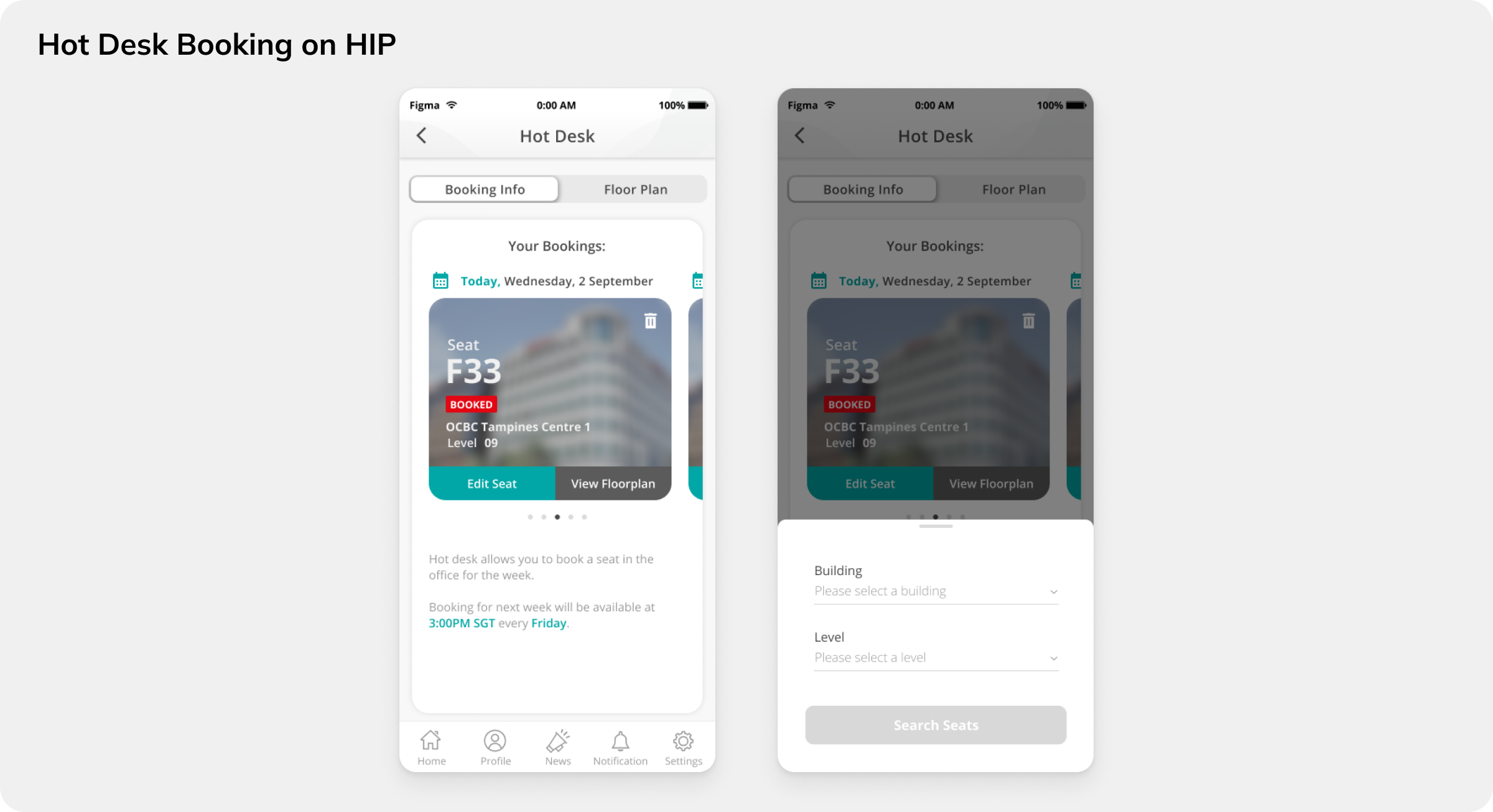 To begin booking, users would have to select the building and level they want to work in. Only then will the system start loading the office’s floorplan for seat selection.