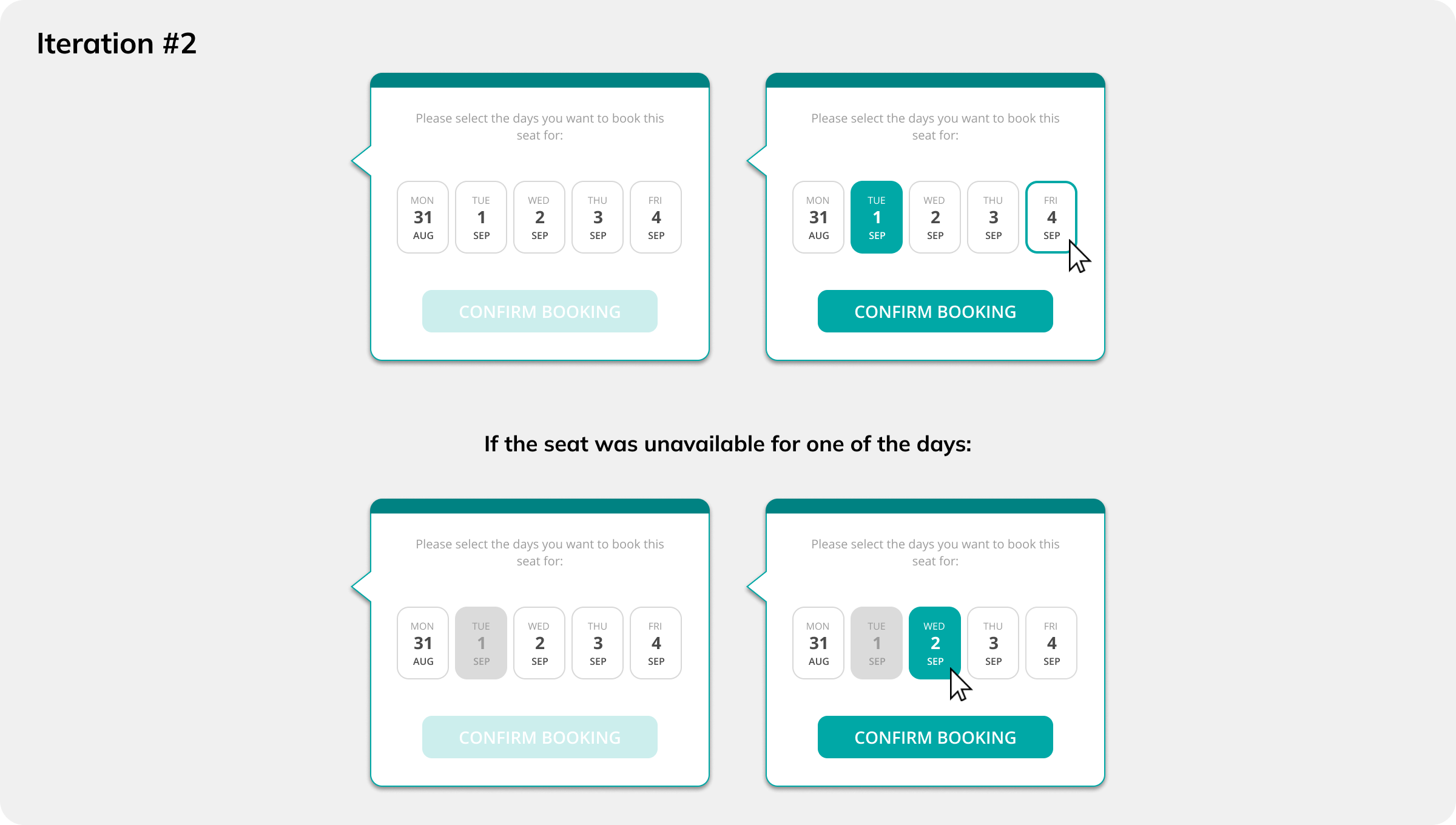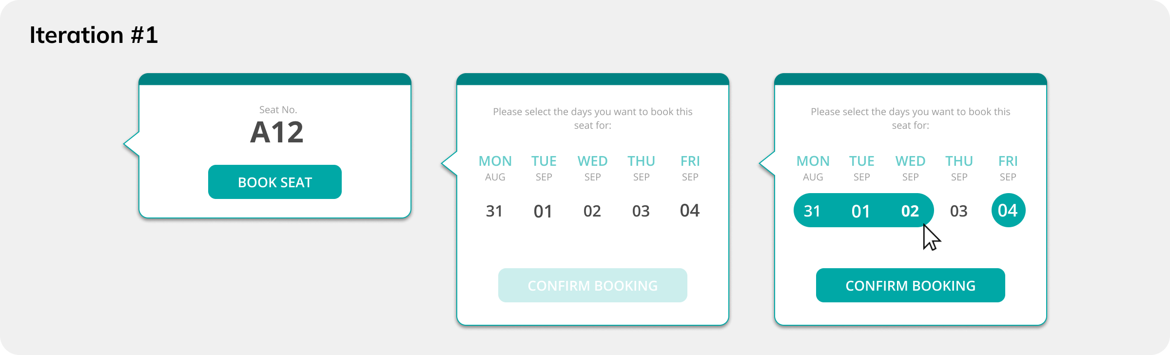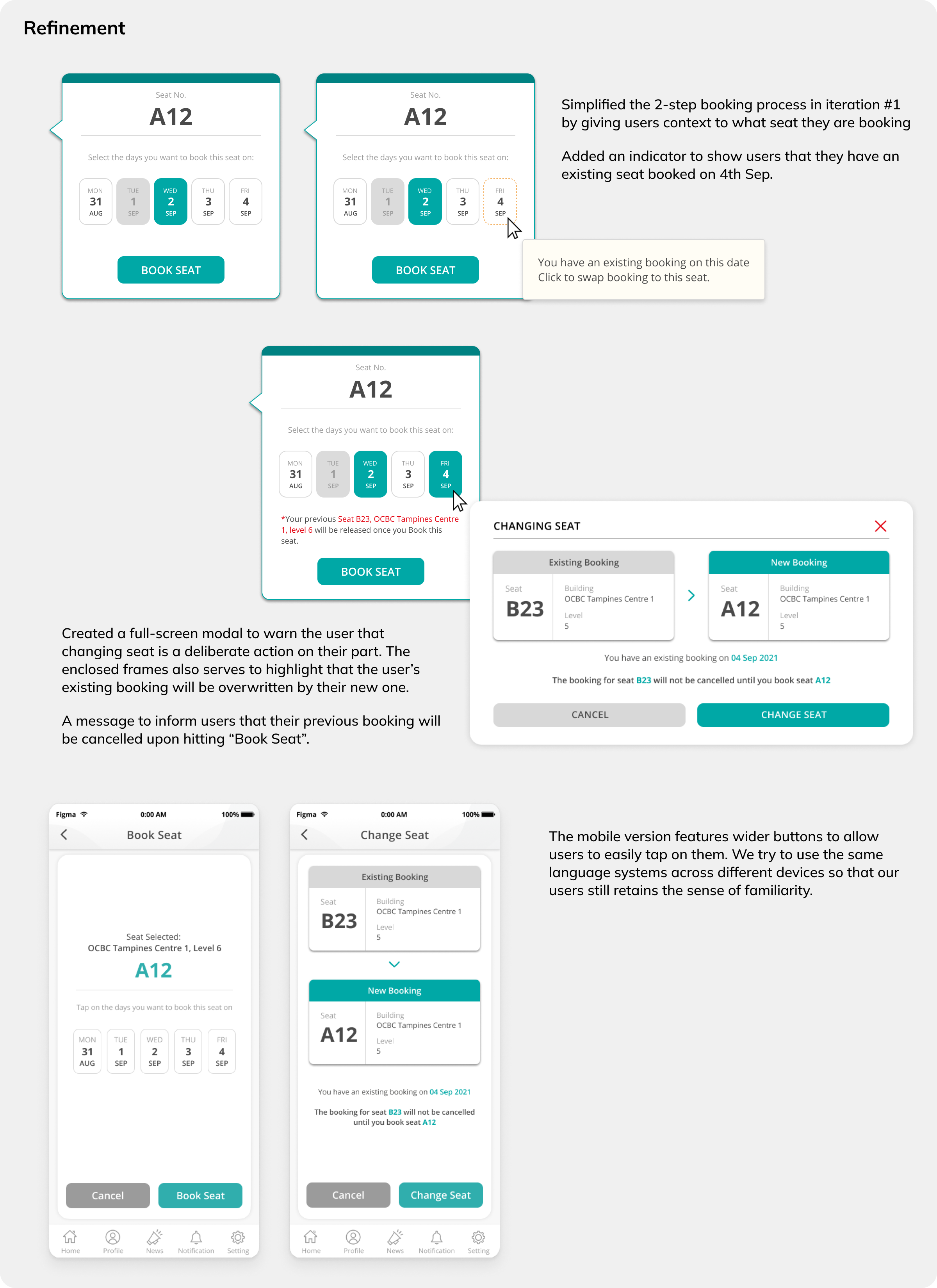 Initial usability tests suggested that users expected to book seats right after clicking the “Book Seat” button on the left, and did not expect that they would be able to select dates.