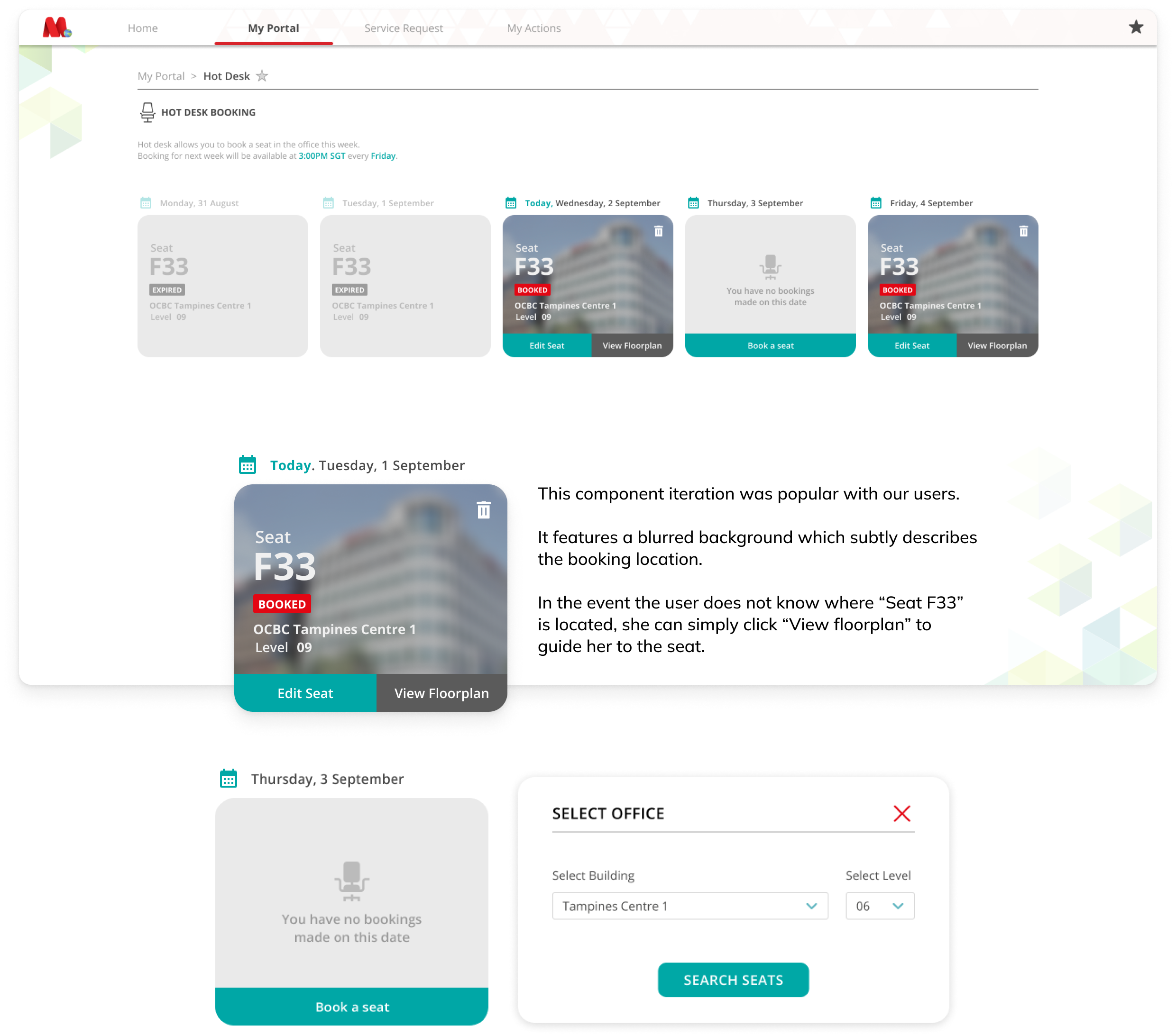 This form-like inputs were immediately familiar to our users because of existing mental models. It was easy for them to use. By placing the selection at the top, users understood that a corresponding floorplan will be loaded based on their selection. Without having to navigate to the main menu, users had the ability to change the date, or office, to suit their needs.