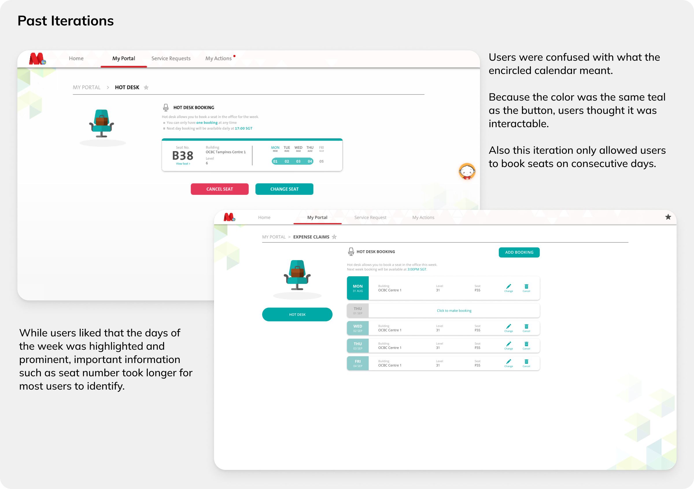 Due to the insights stated above, our users and stakeholders were hesitant about allowing staff to book seats too many days in advance. We settled on 1 week during the pilot launch to gauge ground sentiment and gather more feedback. Stakeholders were amenable to adjust a 1 week booking cycle to 2 weeks depending on the need.