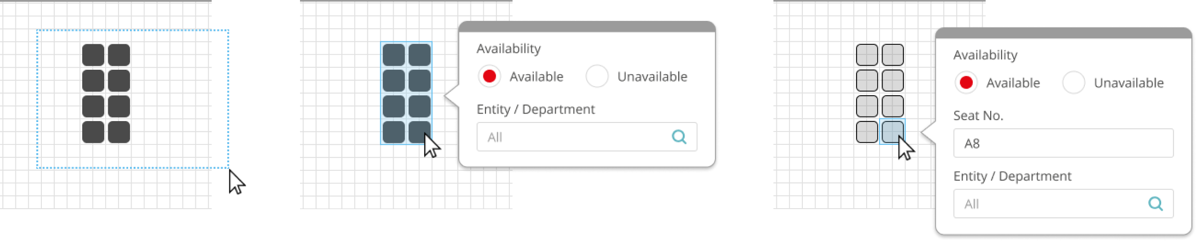 Users could also easily select seats once they’ve placed them to change the seats’ availability status. These interactions make use of mental models established by software our users are familiar with, like PowerPoint.