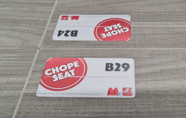 “Chope” is a Singaporean slang for “Reserved”. This label is also designed to look like a packet of tissues, usually left on hawker tables to indicate the table has been reserved.
